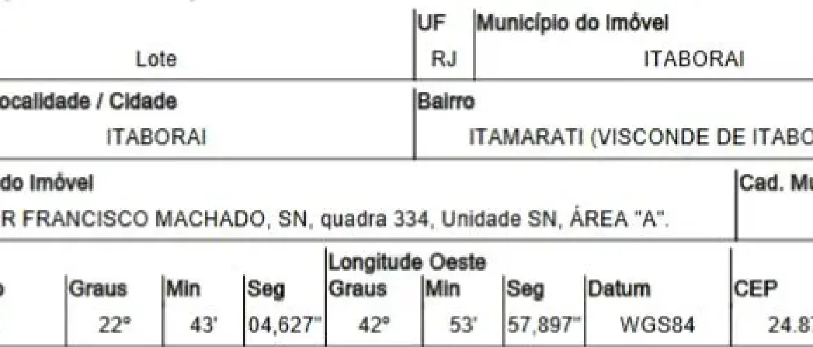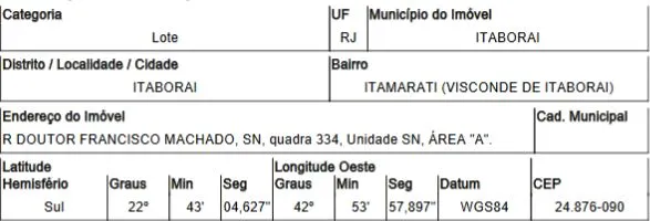 RUA DOUTOR FRANCISCO MACHADO,N. SN QD 334, AREA A, ITAMARATI (VISCONDE DE ITABORAI) - CEP: 24876-090, ITABORAI - RIO DE JANEIRO nº 334