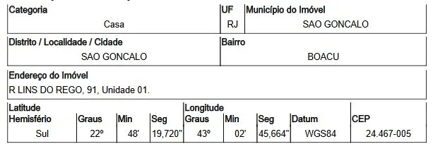 RUA LINS DO REGO,N. 91 CS 01, BOACU - CEP: 24467-005, SAO GONCALO - RIO DE JANEIRO nº 91
